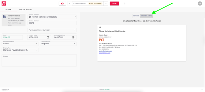 Tabbed Interface - The right panel of the invoice review screen now contains two tabs: "Invoice" (showing the invoice document) and "Original Email" (showing the complete email content).