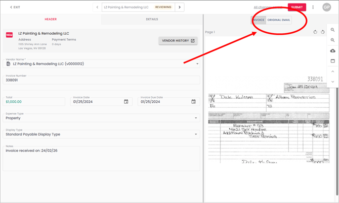 Tabbed Interface - The right panel of the invoice review screen now contains two tabs: "Invoice" (showing the invoice document) and "Original Email" (showing the complete email content).